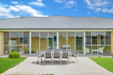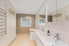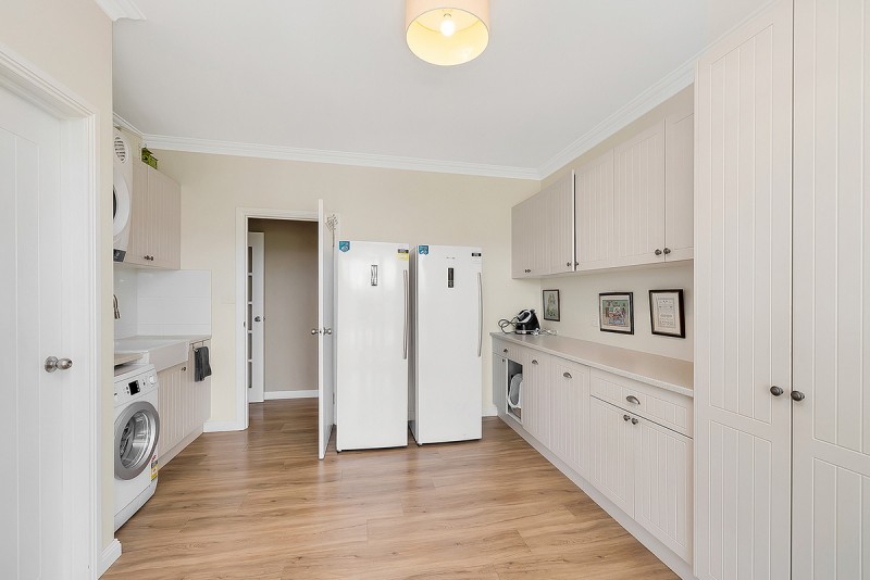 The large master bedroom has a full ensuite and walk-in robe, the 2nd bedroom also has a walk in robe while the remaining two bedrooms have built in robes. The tiled family bathroom consists of a separate bath and shower, double vanity and fan. Both bathrooms have under floor heating. There is a separate powder room with toilet and the laundry has laminate benchtops, cupboards and storage. A fully glassed alfresco provides light and space and adds an extra living space all year round.
