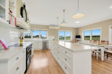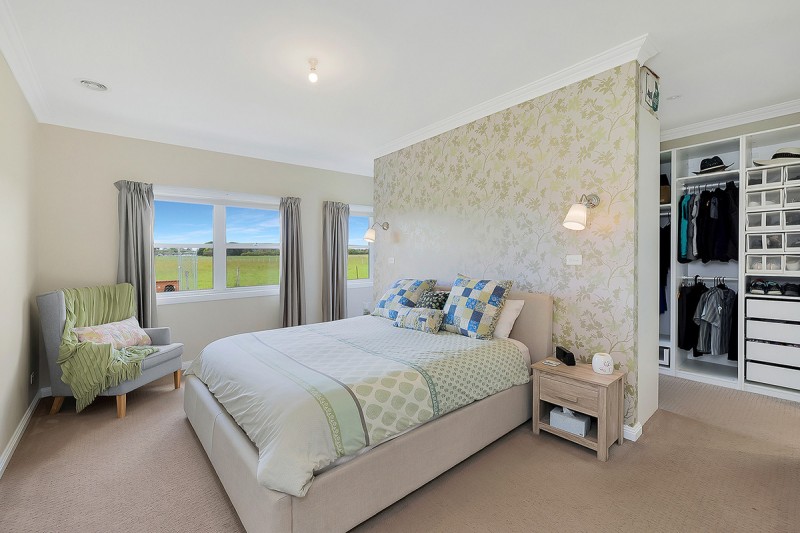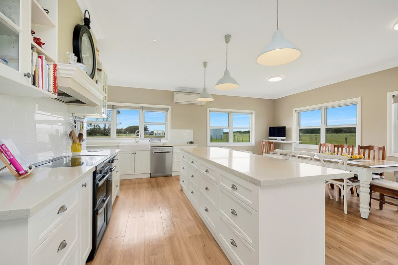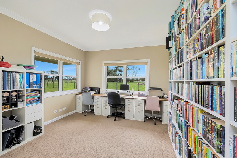 The home is centred around the open plan kitchen, dining living area with the kitchen featuring Caesar stone bench tops, vinyl cupboards and draws, 900mm Belling oven and induction hotplates, dishwasher and Butlers pantry. Large windows open the dining area to expansive views across the paddocks towards Terang and Mt Noorat and the massive lounge area is the centre of the home and comes with a double sided wood heater which is ducted through the house. The adjoining living room offers a children's retreat and north facing windows. There is a separate well-appointed office suitable for a work from home business or study.