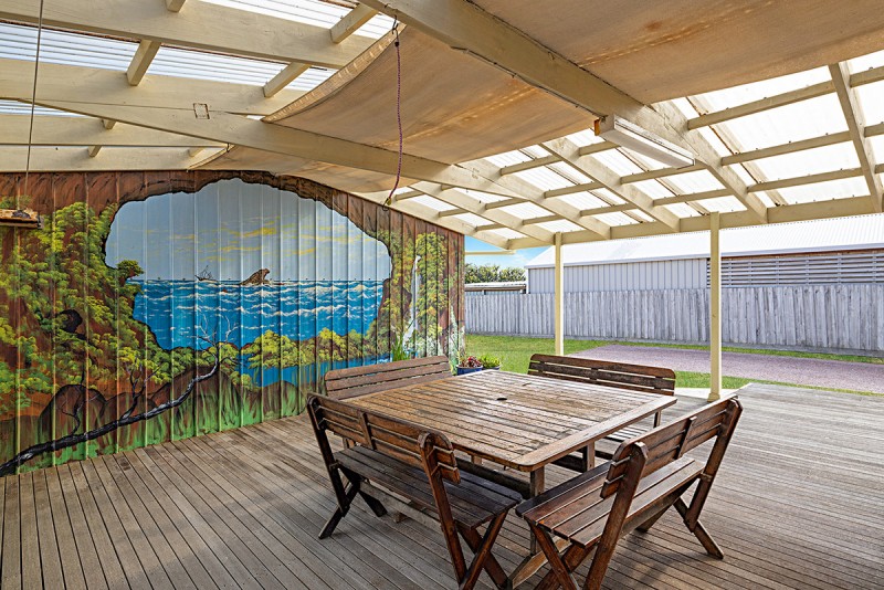 Through double glass doors is a large alfresco covered deck with painted feature wall (ocean scene) and Lazerlite roof.