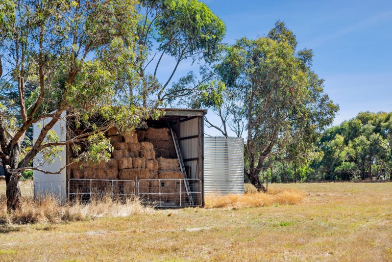 > Outbuildings include 12m x 6m (approx) all steel lock up shed with concrete floor (power) additional second toilet, shower and HWS. 2 haysheds (520 square bales capacity) and steel cattle yards.