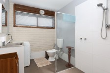 The renovated bathroom incorporates a convenient laundry, walk-in shower, and toilet.