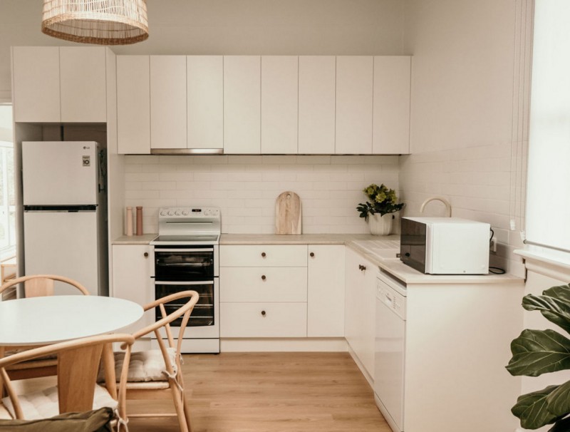 Open plan living is spacious and light with contemporary kitchen complete with excellent storage, stone bench tops and stylish appliances. Dining and living is completed with timber flooring, slow combustion wood heater and split system for year round comfort, large feature window and crisp white finish.