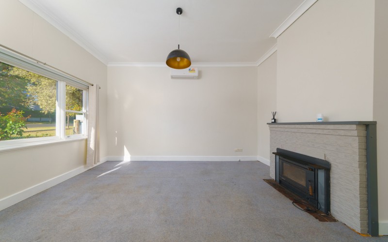 The home features three generously sized bedrooms, a functional kitchen with ample storage, and a welcoming living area equipped with a brand-new split system and cozy wood heater.