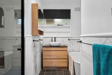 There are four comfortable bedrooms, all with carpeting and ceiling fans, and the master bedroom offers the added benefit of two built-in robes for extra storage. The home also includes a centrally located, recently renovated bathroom with a separate bath and shower, providing a modern and functional space for relaxation.