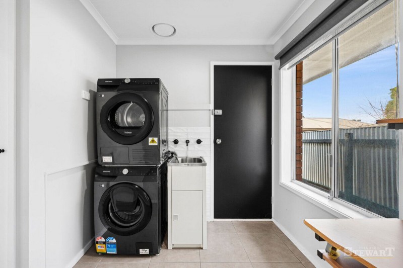 The property features an open-plan living and dining area that seamlessly connects to a bright, functional kitchen. Both bedrooms are equipped with built-in robes and share a centrally located bathroom. A separate laundry with direct outdoor access adds practicality.