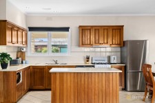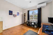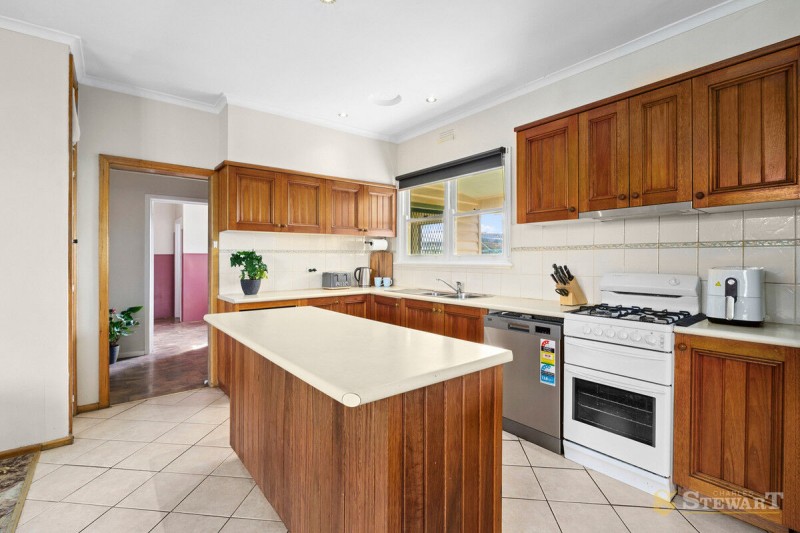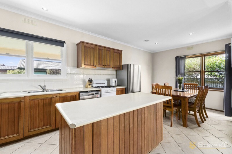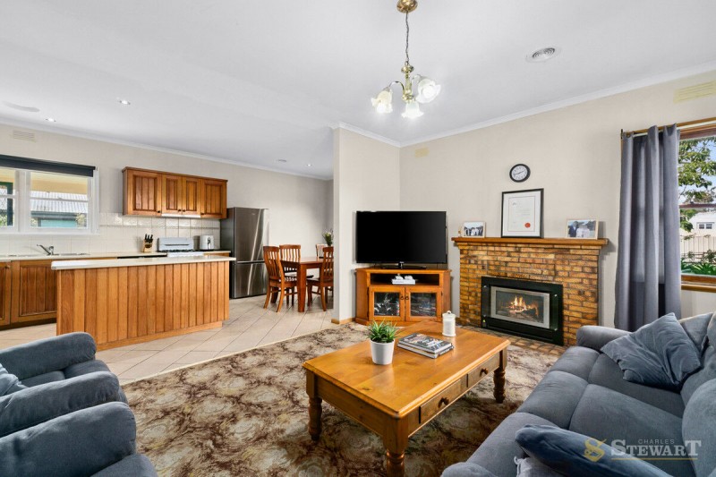 At the heart of the home, the timber kitchen adjoins the dining area and flows into the living room, creating a connected space for family life and gatherings. Ducted gas heating, a split system, and solar panels support comfortable and efficient living throughout the year.