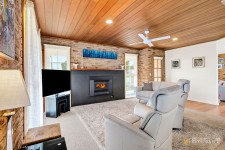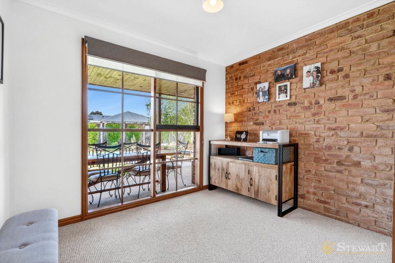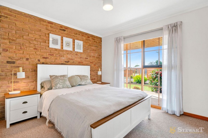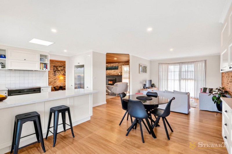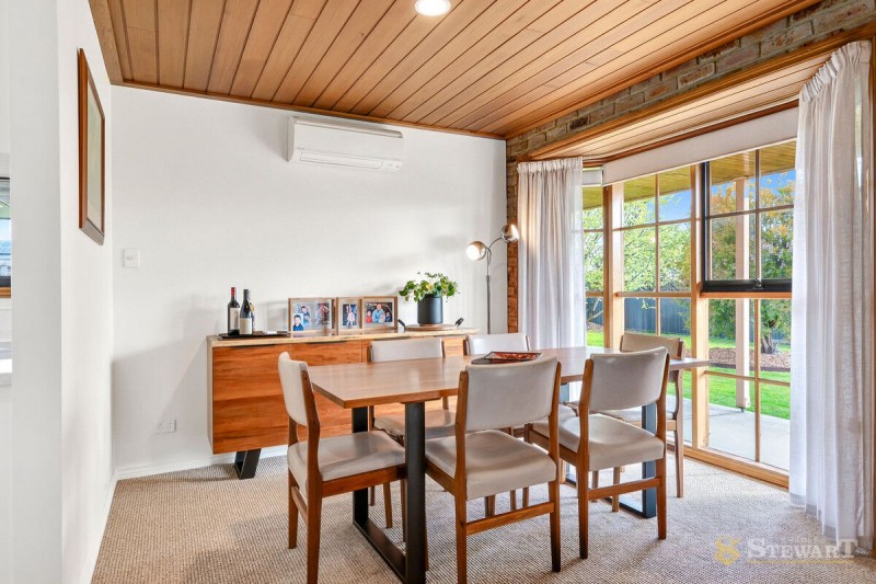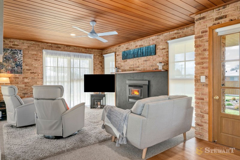 Inside, multiple living zones offer plenty of space for both relaxation and entertaining. The main living area features striking timber-lined ceilings, exposed brick feature walls and a cosy gas fireplace, creating a welcoming atmosphere for family and friends. Large windows throughout flood the home with natural light, while split system heating and cooling ensures year-round comfort.