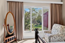 Ornamental grape vines twine along the home's spacious veranda that boasts a lovely elevation overlooking the stunning garden setting, creating a tranquil haven to entertain family and friends year round with the convenience of clear blinds for the winter months.