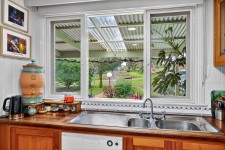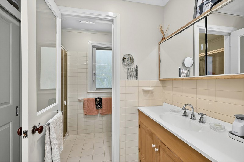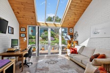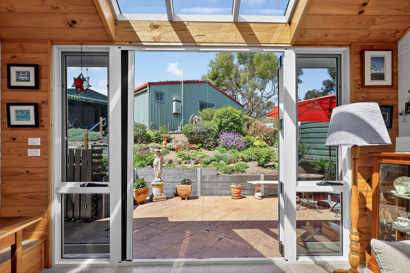 An open-plan galley style kitchen enjoys more tranquil garden outlooks and features a striking jarrah bench tops, overlooking a dining area opening to veranda. A picturesque ornamental grape vine ads a soft leafy screen in the summer months. Main living is cosy and stylish complete with a welcoming slow combustion wood-burning heater and electric ducted heating and cooling. This spacious area flows to a well sized sun room with glass sliders opening to Easterly garden area and has a striking sky light flooding the room with natural sunlight.