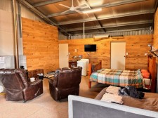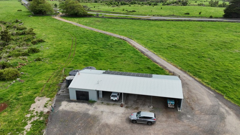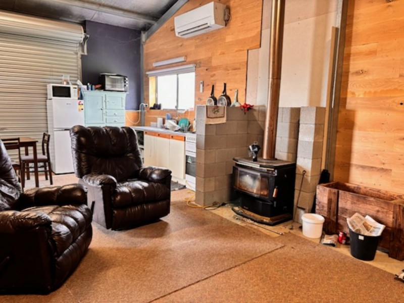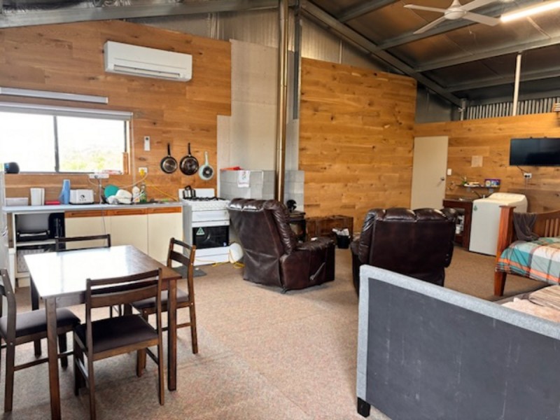 • Quality steel 4 bay machinery shed (24m x10m), incorporating fully lockable self-contained bay providing open living space (instance gas HWS), kitchen with gas stove, reverse cycle A/C, solid wood heater, separate shower/toilet room and operational septic system.
