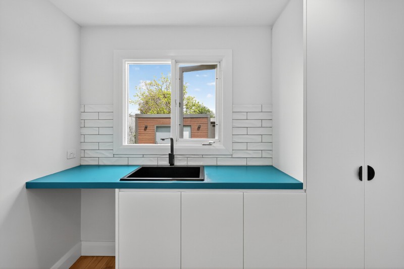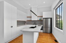 - Modern open-plan kitchen with electric cooktop, oven, dishwasher and double sink