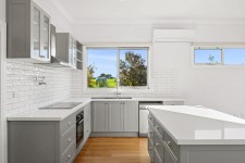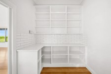 Expansive picture windows draw the landscape in, while pale timber floors and custom-crafted joinery create a subtle interplay of texture and tone. The gourmet kitchen is a triumph of design, complete with striking stone surfaces, induction cooking, a concealed butler's pantry, and an island bench that invites conversation as much as culinary creativity.