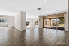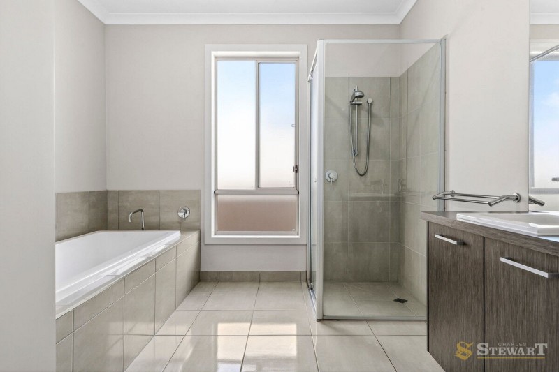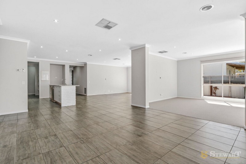 The open-plan kitchen, living and dining area forms the heart of the home, filled with natural light through large windows. The kitchen provides ample bench space and a walk-in pantry with direct access from both the double garage and kitchen.