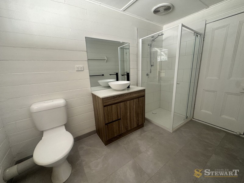 The brand new bathroom is well appointed with modern updates featuring a shower, toilet, and vanity located adjacent to the bedroom.
